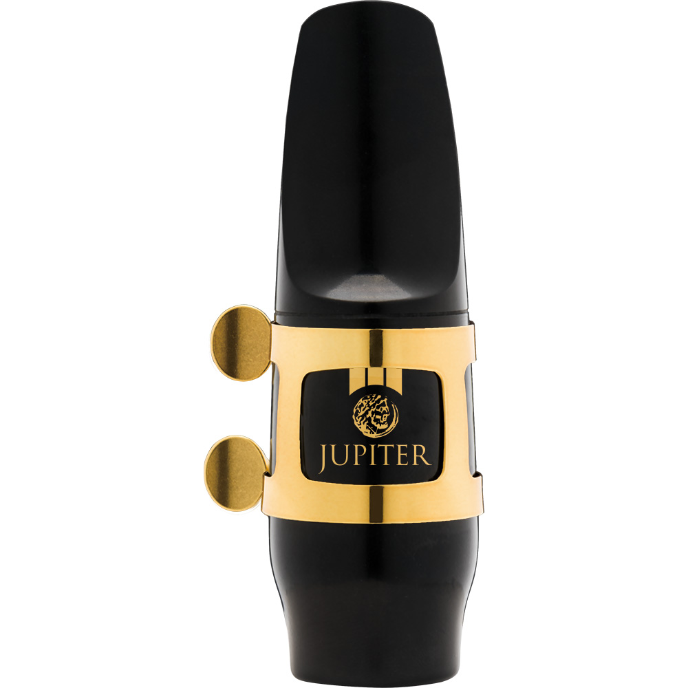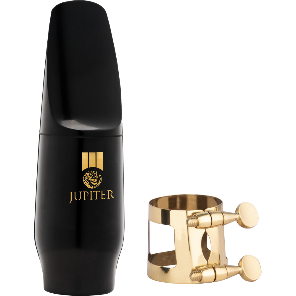 The Jupiter JWM-ASK2 Alto Saxophone Mouthpiece Kit includes a mouthpiece with a gold-lacquered ligature and plastic cap.